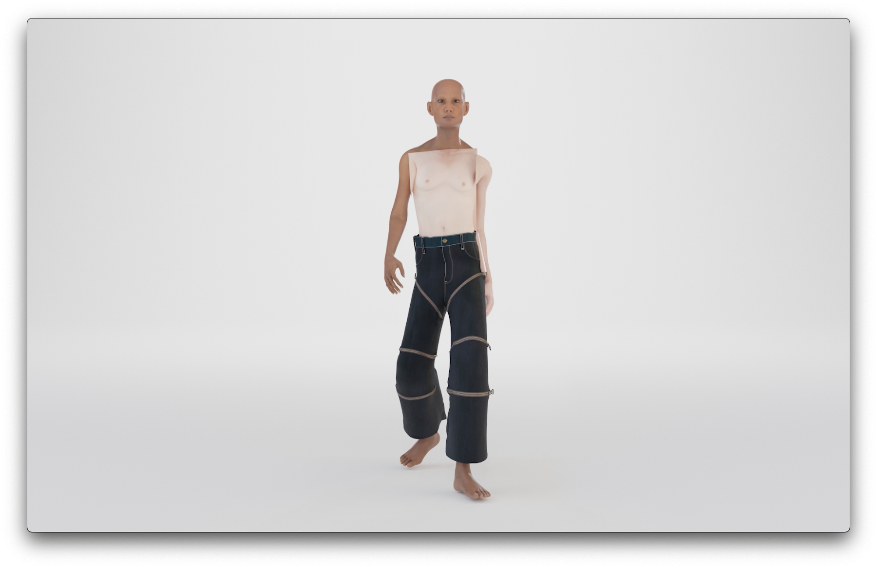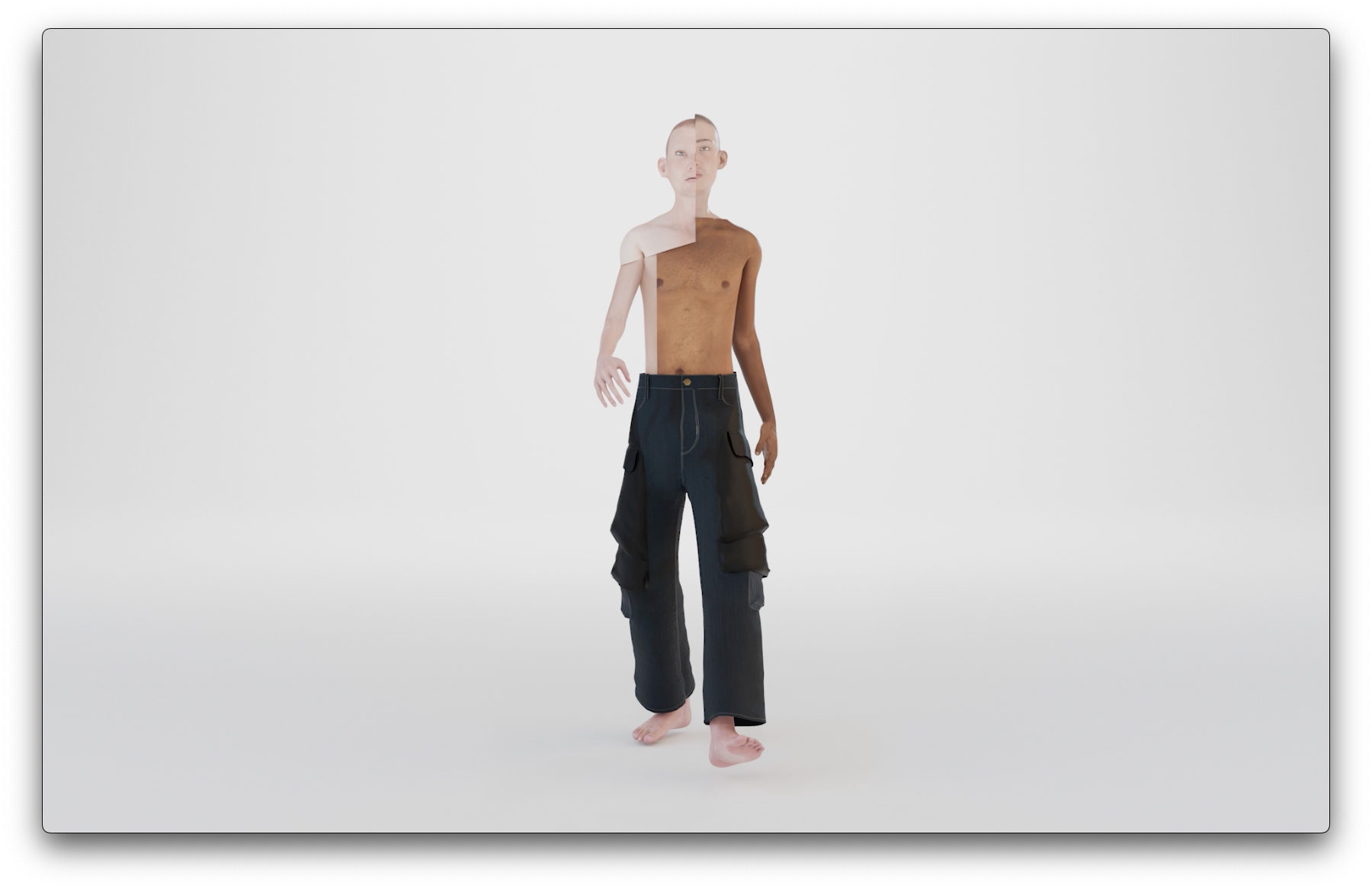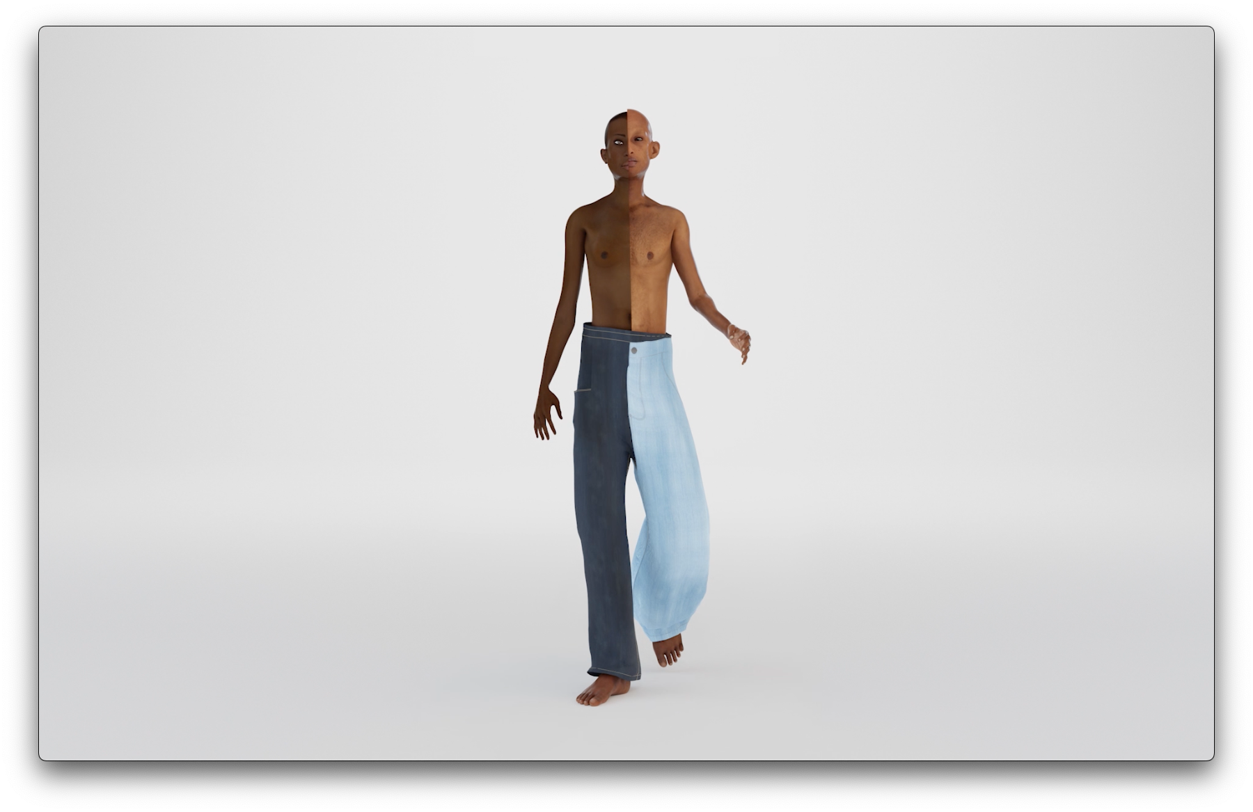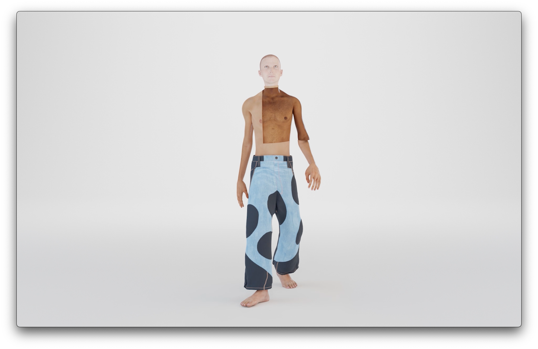 The work proposes an alternative to a singular future of (physical) monoculture and the loss of physical features resulting from infinite crossbreeding. It does so by creating new collaged shapeshifting bodies that emphasize the distinctive features of different skin types, body types, and genders in all their original beauty. Within each of the five physical compositions of the body, the two artists experiment with various ways different body parts and limbs can create new shapes of beauty. This is achieved by combining the bodily features and physical aesthetics of cultures worldwide, presented in a place devoid of visual input