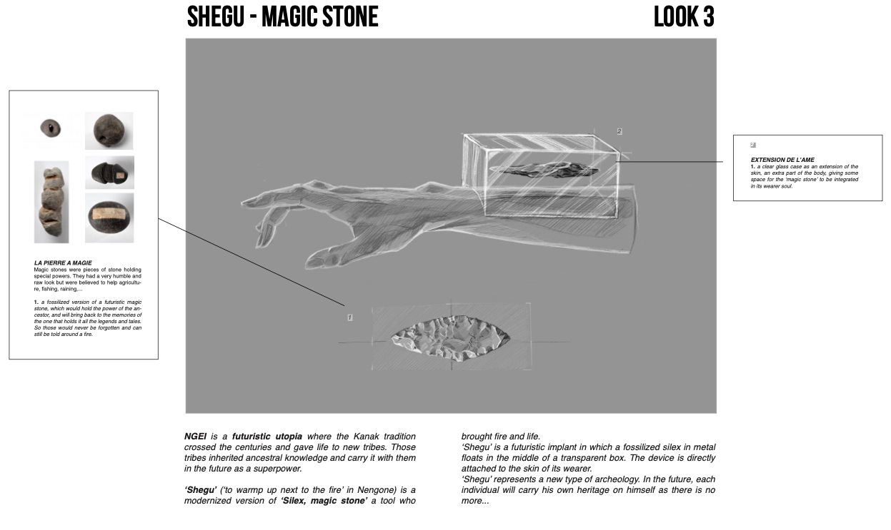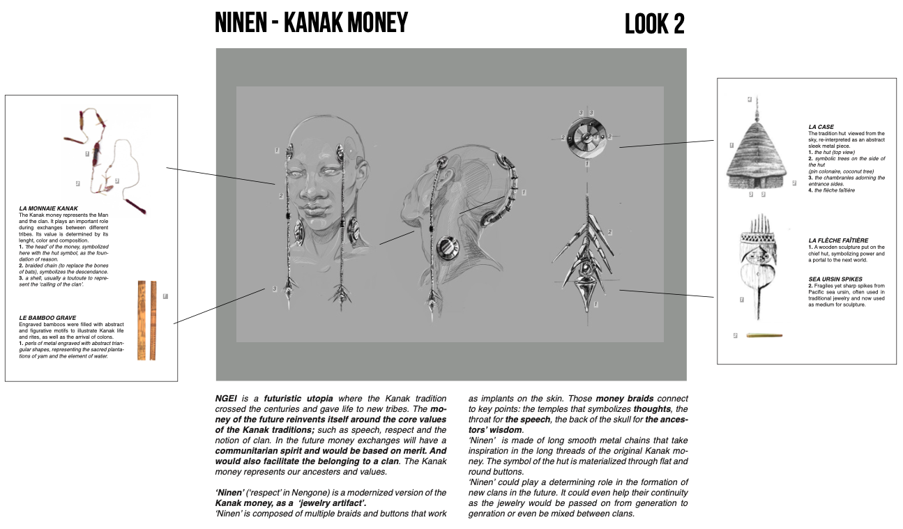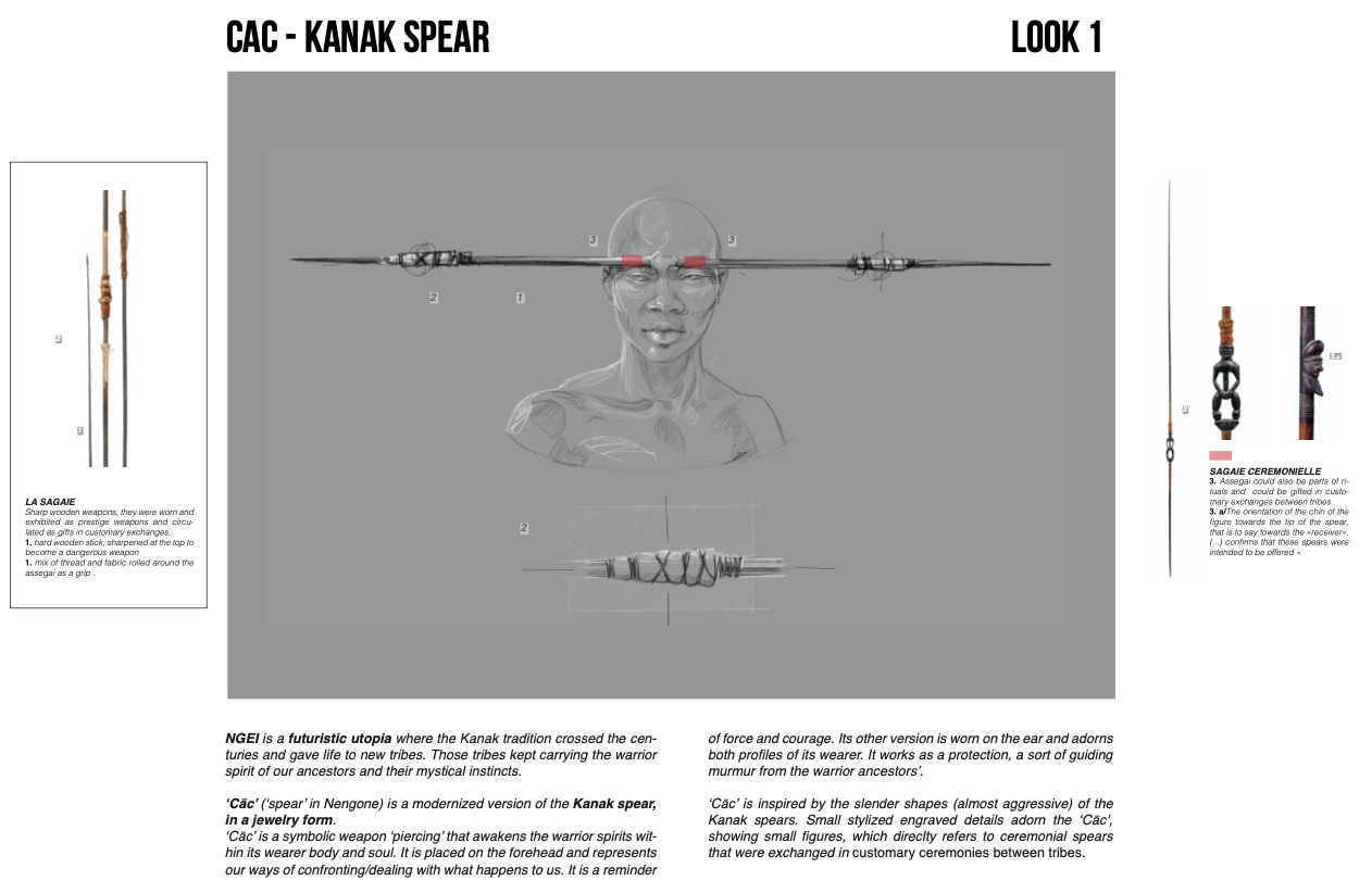 « In a world where indigenous cultures slowly disappear , we can wonder how traditions can evolve with us. » Loan Favan is a jewelry artist from New Caledonia, Pacific. The leitmotiv of her work is her Pacific heritage. She feels the need to give back to her island and share their stories and traditions. Therefore she creates conceptual jewelry or futuristic ‘artifacts’ that carry the spirits and mystical powers of the island. Her works gravitates around the idea of redefining what will make the human of tomorrow. Will our origins still define us? Will our nature be interchangeable? What will empower us? What will give us a sense of belonging?... ‘NGEI’ translates to ‘later in the future’ in Nengone, language from Maré, New Caledonia and is a collection of 3 monumental accessories inspired by the Kanak artifacts. The concept of NGEI is to juxtapose the ancient artifacts next to their futuristic version and thus re-question the mutation of customs. The research process behind the project has also been a way for Loan to come back to her roots, and witness the impacts of colonization on Education and Identity. NGEI is composed of 3 monumental jewelry pieces inspired by the Kanak money (NINEN), ceremonial spears (CĀC) and the magic stones (SHEGU) of New Caledonia. Each object contains specific references taken from travelers’ discovery diaries and traditional legends. The pieces then become much more than simple jewelry, they become futuristic artifacts; « charged with symbols that convey our past values and identities into the future. » NGEI was crowdfunded in August 2021 online and exhibited in May 2022, in Bali Indonesia and becomes a futuristic utopia where the Kanak traditions crossed the centuries and gave life to new tribes…