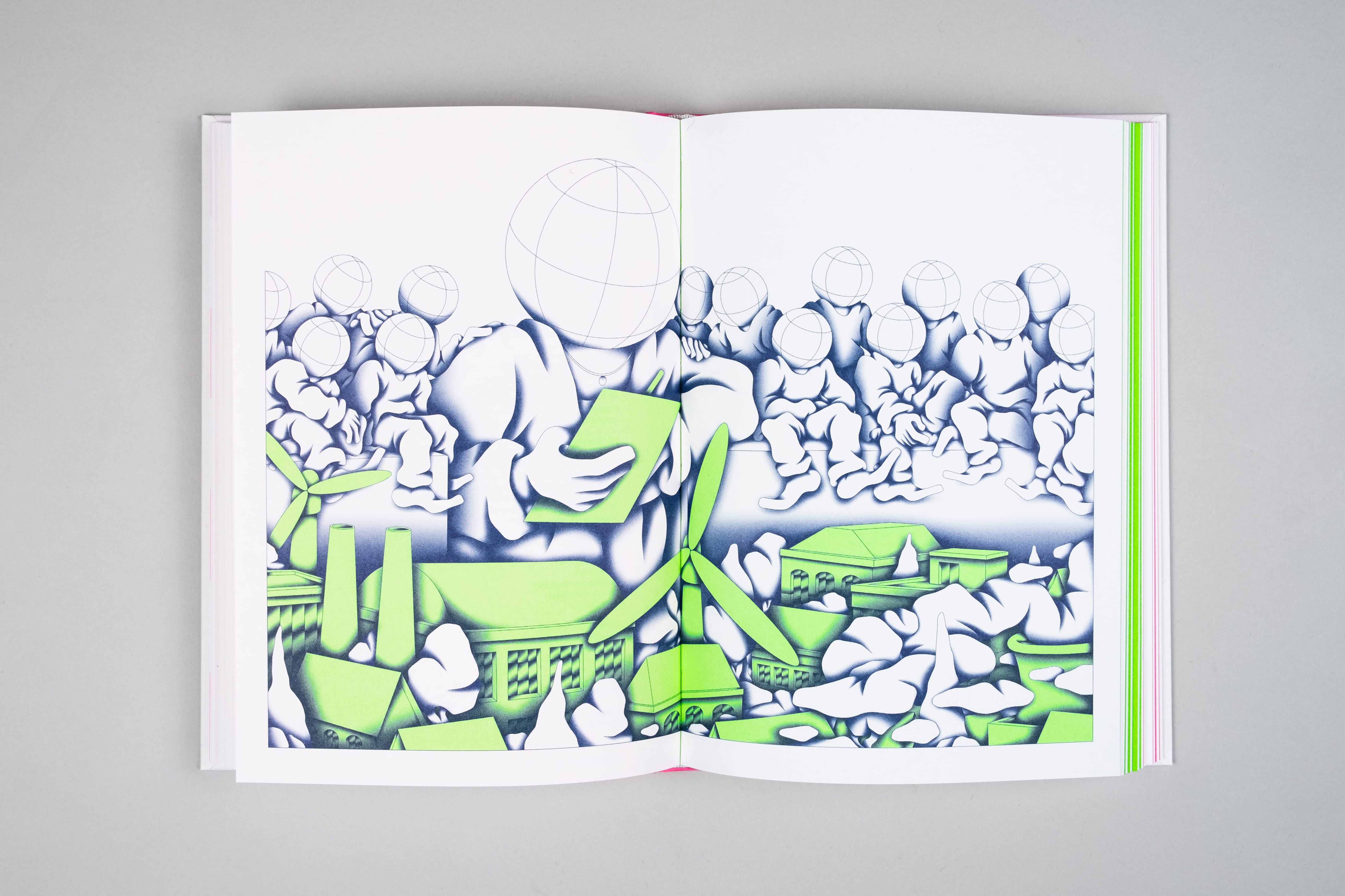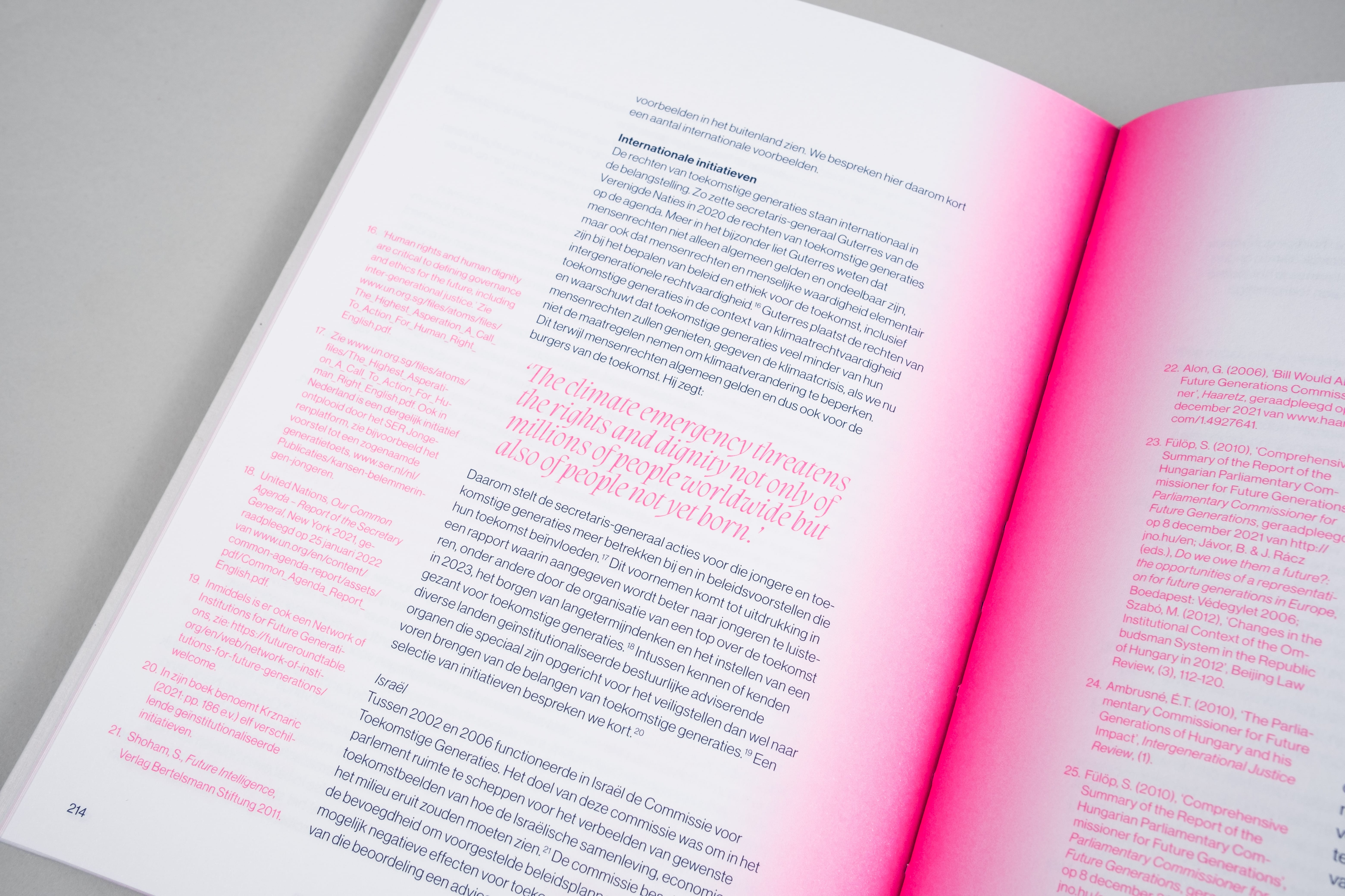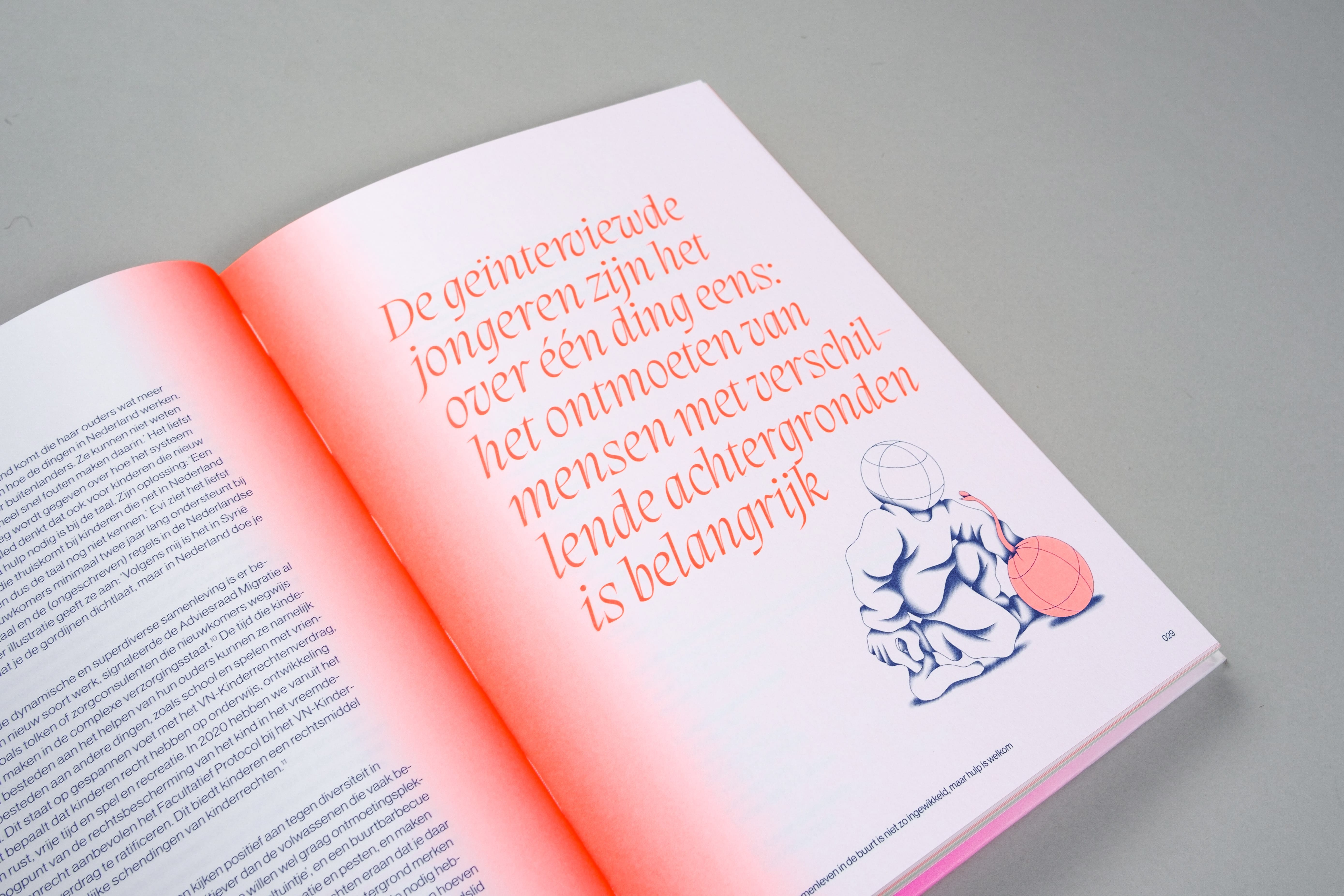 De visie van 14 adviesraden op een hoopvolle toekomst voor jongeren hebben we gebundeld in een opvallend vormgegeven boek. Het boek valt op door zijn fluorescerende kleurovergangen en experimentele typografie. We hebben Tim Mulder gevraagd om ons te helpen met de illustraties. Met zijn personages met ‘globe heads’ en te grote voeten geeft Tim ons een nieuwe kijk op dit complexe onderwerp.